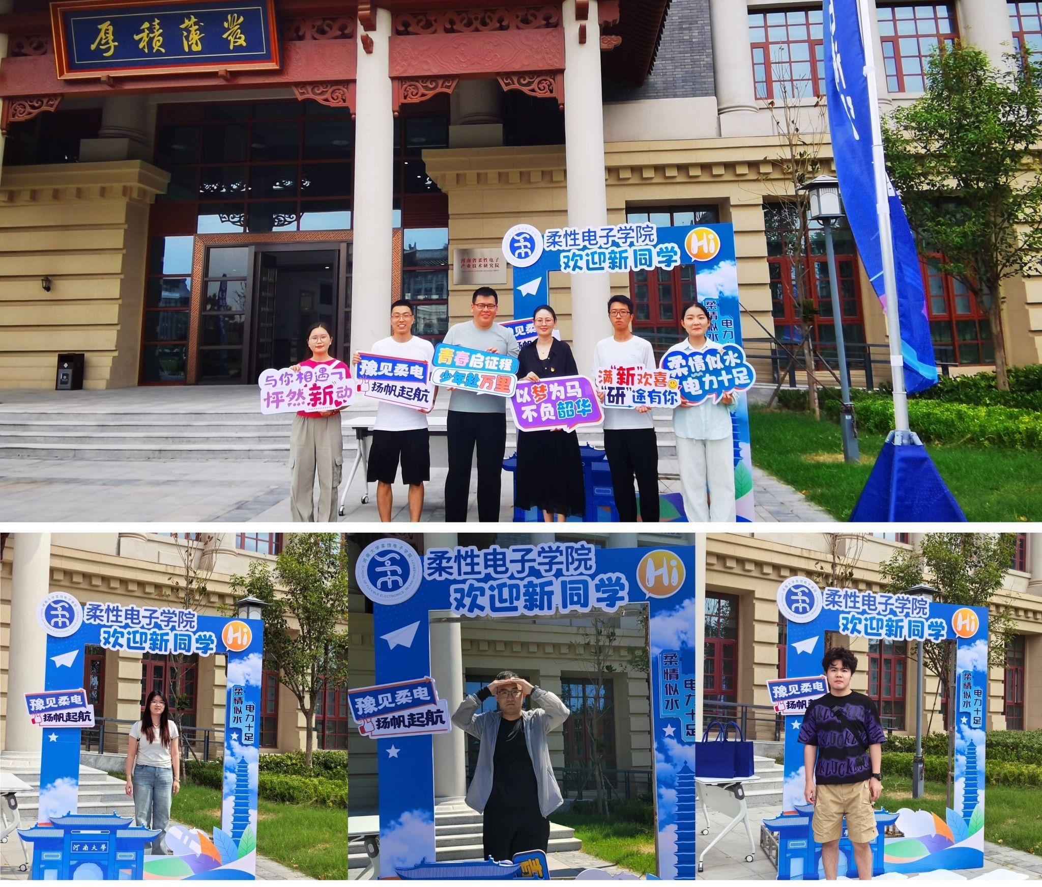 精心布置的迎新站前打卡拍照留念,用相机定格这一具有特殊意义的时刻。