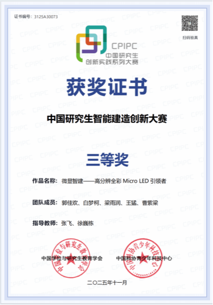 近日,2025年“中国研究生智能建造创新大赛”落下帷幕,大赛共报名1316支团队,提交作品1216件。经过初赛评审,共有336支队伍成功晋级全国总决赛。我院郭佳欢、白梦柯、梁雨润、王猛、曹紫梁组成的团队,在张飞、徐巍栋两位导师的指导下,凭借作品《微显智建——高分辨全彩Micro LED引领者》脱颖而出,荣获全国三等奖。